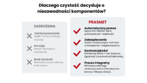 Czystość to dopiero pierwszy krok. Prasmet stosuje również system zabezpieczenia antykorozyjnego, który chroni elementy przed utlenianiem i działaniem wilgoci w czasie transportu i magazynowania. Warstwa ochronna nanoszona jest w sposób kontrolowany, tak aby nie wpływała na wymiarowość ani funkcję detalu, a jednocześnie skutecznie przedłużała jego trwałość. To szczególnie ważne w branżach, gdzie nawet niewielka korozja może zagrażać bezpieczeństwu końcowego produktu – np. w przemyśle motoryzacyjnym czy elektrotechnicznym.