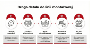 Dzięki temu proces mycia jest w pełni zgodny z rygorystycznymi normami branży automotive i elektronicznej. Każdy etap – od wstępnego oczyszczania po zabezpieczenie antykorozyjne – jest nadzorowany przez zespół technologów, co daje klientom pełną pewność co do jakości i powtarzalności każdego zamówienia.